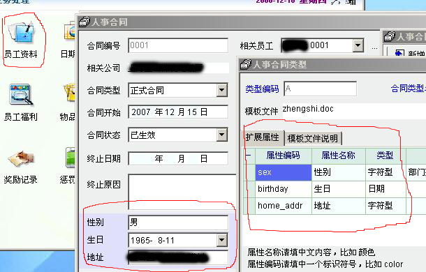上次我提的问题答案找到了,但试用后发现在人事合同类型里定义扩展属性后只是在合同页面里多了一个框自己填数据!。比如默认里没有的地址 身份证等。但在员工资料里我已经输入过了,有什么方法可以在人事合同里引用员工资料里的一些属性吗?