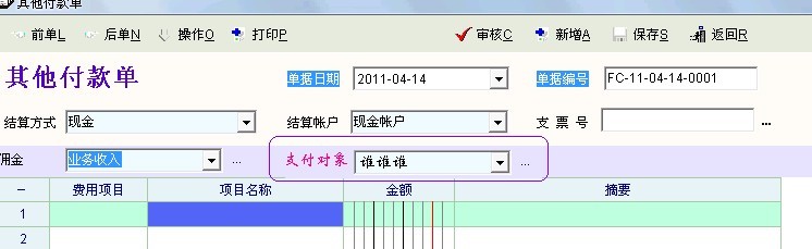 2、在付款单里,应有一个【支付对象】,可以调取渠道代理中的人员。
