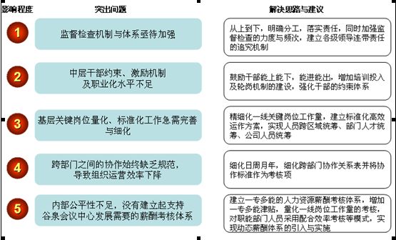 5、内部公平性不足,没有建立起支持谷泉会议中心发展需要的薪酬考核体系。