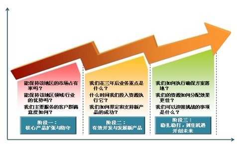 管理学上有一句名言:“1个管理决策的错误,500个执行也弥补不了。”可见战略定位决策在企业管理上举足轻重的作用。战略的选择可以让企业能够更加明确自己的客户是谁,哪些事情能做,哪些事情不可以做,因此战略管理的核心也可说是“防止南辕北辙”的事情在企业发生。我们在做选择题,评估什么样的选择对我们长期有益,什么选择对现实收益有益,然后决定我们怎样做,因为目标的准确清晰才是企业快速获得增值和提升的根本原因。经过多年的实践经验,华恒智信专家建议从三个阶段来评判和定位公司的发展战略,各阶段都要有不同的发展目标。如下图: