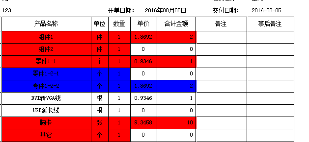 为实现打印模板配底色,如下图所似,代码放在了后面,只是为了实现这样式,所以脚本写得有点粗糙,有需要的朋友可以拿去看下,麻烦把完善后的脚本发往论坛供大家使用,谢谢! 谢谢吴老师倾力奉献! int before_draw_obj() { //---------根据产品类别将必需要底色的配色 if (to_draw_obj == 'res_name' || to_draw_obj == 'inp_unit_type_name' || to_draw_obj == 'inp_num' || to_draw_obj == 'inp_price' || to_draw_obj == 'cap_inp_price' || to_draw_obj == 'item_id' && res_cat_id == '102') pp_fill_color = 0x0000ff ; else if (to_draw_obj == 'res_name' || to_draw_obj == 'inp_unit_type_name' || to_draw_obj == 'inp_num' || to_draw_obj == 'inp_price' || to_draw_obj == 'cap_inp_price' || to_draw_obj == 'item_id' && res_cat_id == '103') pp_fill_color = 0xff0000 ; else if (to_draw_obj == 'res_name' || to_draw_obj == 'inp_unit_type_name' || to_draw_obj == 'inp_num' || to_draw_obj == 'inp_price' || to_draw_obj == 'cap_inp_price' || to_draw_obj == 'item_id' && res_cat_id == '10104') pp_fill_color = 0x0000ff ; else pp_fill_color = 0xffffff ; //---------将单价为0单元格配白色 if (to_draw_obj == 'inp_price' && inp_price == 0) pp_fill_color = 0xffffff ; //---------不同类别单元格不同值配色(以下是合计为0为白色,不为0为类别色) if (to_draw_obj == 'total_amount' && total_amount == 0 && res_cat_id == '102') pp_fill_color = 0xffffff ; if (to_draw_obj == 'total_amount' && total_amount != 0 && res_cat_id == '102') pp_fill_color = 0x0000ff ; if (to_draw_obj == 'total_amount' && total_amount == 0 && res_cat_id == '103') pp_fill_color = 0xffffff ; if (to_draw_obj == 'total_amount' && total_amount != 0 && res_cat_id == '103') pp_fill_color = 0xff0000 ; if (to_draw_obj == 'total_amount' && total_amount == 0 && res_cat_id == '10104') pp_fill_color = 0xffffff ; if (to_draw_obj == 'total_amount' && total_amount != 0 && res_cat_id == '10104') pp_fill_color = 0x0000ff ; return 1; }; |