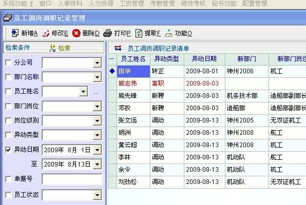 1、当添加“岗位类型”--新聘、“异动日期”--8/1-8/13,再按检索,无内容(事实上,有两位同志在8月3日属新聘)。如图1