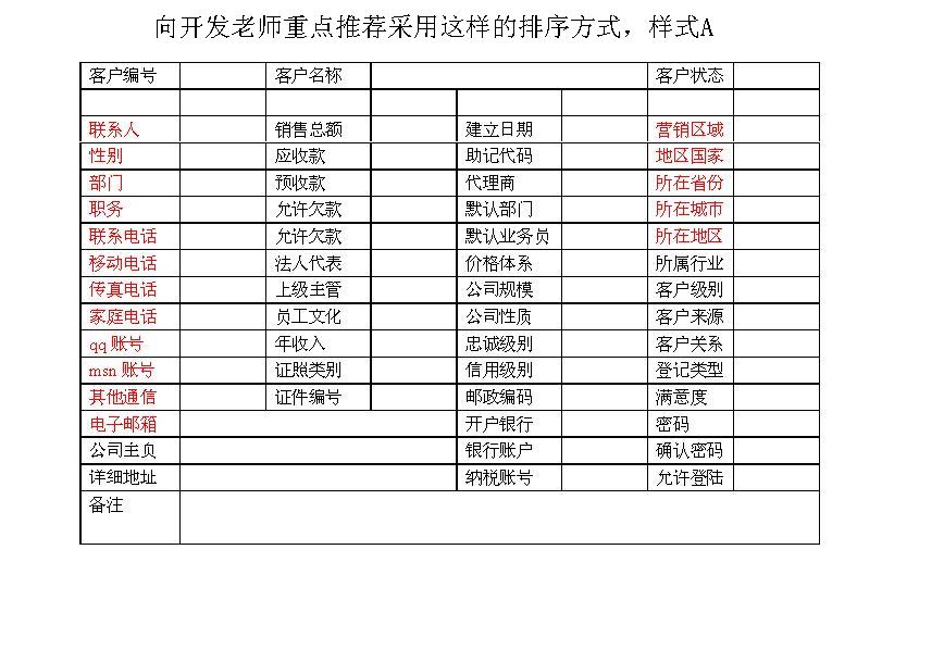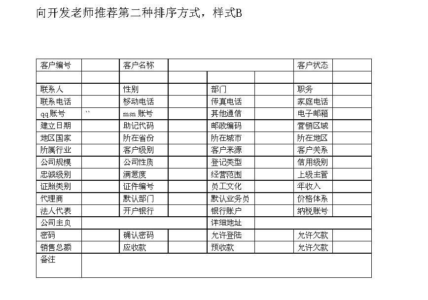软件开发的老师 您好 我是客户软件的忠实用户,向开发老师提出几个建议,恳请软件进一步改进。谢谢啦!!! 1、 建议软件开发老师采用我设计的客户管理界面,关联项组合在一起,利于信息输入。不显得杂乱。 2、 客户编辑整体的各要素能否自我定制所需要的要素,自行排序组合。那是再好不过啦。 3、 在客户编辑中的联系人列表中,联系人可以进行“显示定制”各项联系人的要素。现在客户编辑中的联系人列表中只显示姓名,办公电话,职务。建议可以定制显示更多项。 4、 在客户编辑中的分类信息中的客户请求、投诉建议、客户联系、商业机会、销售业务中的各项可以实现编辑。而不是单一的到销售管理或者客户市场的下拉菜单中去也进行编辑。也应该可以客户编辑中的分类信息中的“客户请求、投诉建议、客户联系、商业机会、销售业务”的各项要素中实现编辑管理。双重管理编辑。另外建议在客户编辑中的分类信息中增加“合同管理”。 5、 秘书功能中的日程安排、计划管理、常规安排、工作日志、任务管理、备忘录、太杂乱,不易管理。如果能集合在一起,进行统一管理就最好,不会因为登记到其它项目中而遗漏。 6、 在销售合同的客户名称一栏中查找客户时建议增加像销售订单,销售发货等中的“单位定位-营销区索引树”的应用命令栏,便于快速查找客户。 7、 建议将客户编辑中的密码,确认密码,允许WEB登陆,专门做一个菜单管理。 客户编号 客户名称 客户状态 此致 敬礼 忠实使用者和推广者。 2009-11-16 |