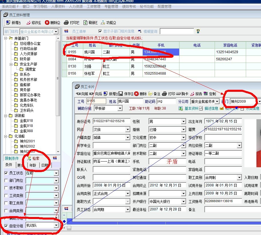 如我想检索“机动队”在职人员时,却把“神州2009”的姚兴国给检索出来了。再说,我的机动队在职的有20个,现在这样一检索,只有4个人了,其它就不在了?没有加入其它任何条件,如图: