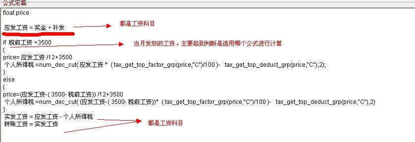 关于一次性奖金计算个人所得税的计算公式(适用3500元起征点) 各位HR大家好: 年终了,除了大家在为年终的一次性收入而兴奋的时候,做HR(没有专业软件)的一定特别的头疼个税的计算,为此,在元旦这几天的假期内,写了一个关于计算一次性收入的公式,分享给大家,希望能给大家提供些方便。 根据税务总局关于年终奖缴纳个税的计算公式: 税前工资-3500(起征点) a:若>0,则直接用年终奖金额/12 = 应税额,得出相应的税率 计出的税率 * 年终奖金额 = 应扣个税 b:若<0,[用年终奖金额 - (3500-税前工资)]/12 = 应税额,得出相应的税率 计出的税率 * (年终奖金额+税前工资-3500)= 应扣个税 在软件里面的公式可以写成如下: 1、可以在平台--工资管理--套餐设置中设置 2、精确到小数点后两位,适用最新的3500元起征点 3、在工资科目中设置:奖金、税前工资,个人所得税、实发工资、转账工资(如果采用银行转账的话) 4、公式设置如下: float price 应发工资 = 奖金 + 补发 if 税前工资 >3500 { price= 应发工资 /12+3500 个人所得税 =num_dec_cut( 应发工资 * ( tax_get_top_factor_grp(price,"C")/100 )- tax_get_top_deduct_grp(price,"C"),2); } else { price=(应发工资-( 3500- 税前工资)) /12+3500 个人所得税 =num_dec_cut( (应发工资-( 3500- 税前工资))* ( tax_get_top_factor_grp(price,"C")/100 )- tax_get_top_deduct_grp(price,"C"),2) } 实发工资 = 应发工资 - 个人所得税 转账工资 = 实发工资 |