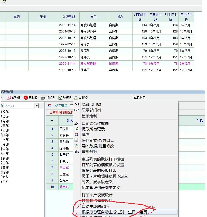 =》重进系统,点击员工资料管理功能菜单下的《根据身份证号码生成性别、出生日期、籍贯》