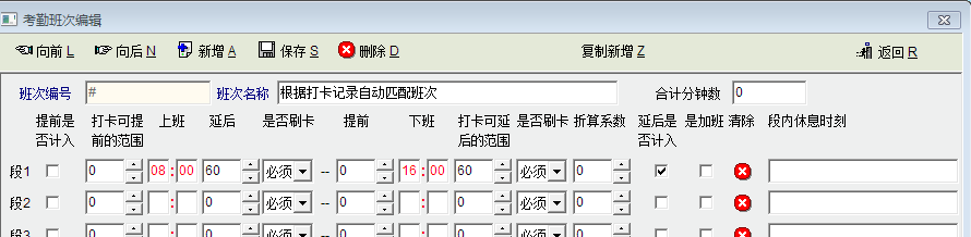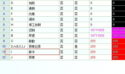 计算规则是月帐的,月底出报表的时候用的,数据来源就是日帐没错,日帐数据精准是生成月帐的前提。 至于缺打卡,我是这么用的,行政班中午上下班忘打显示缺卡 int a0,a1,时间1 a0=to_int(str_get_sub(on_time_1,0,2)); a1=to_int(str_get_sub(on_time_1,3,2)); 时间1=a0*60+a1 if(时间1>0 && 时间4>0) { if(时间2==0 || 时间3==0) { 计算结果="I" } } 字典里考勤结果定义一个缺卡 |