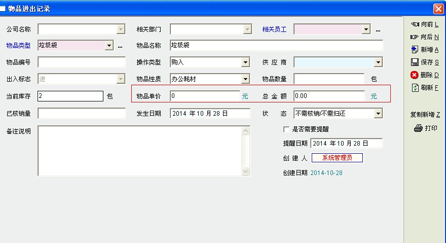 办公物品通过采购入库的时候,单价和金额无法自动提交到物品管理存货报表里的单价和金额里体现!只能去物品定义里面定义,因为每次购买的相同产品有可能价格不一样!每月统计报表无法统计库存金额