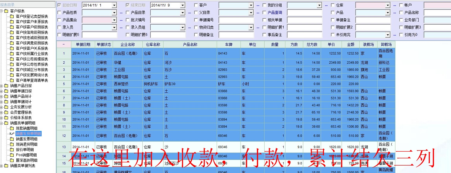 老师,可以在销售报表--销售类单据明细中加入收款,付款,结欠款三列吗?因为这样方便对帐,像软件中原来在往来款项中对帐,有些人看并不懂!