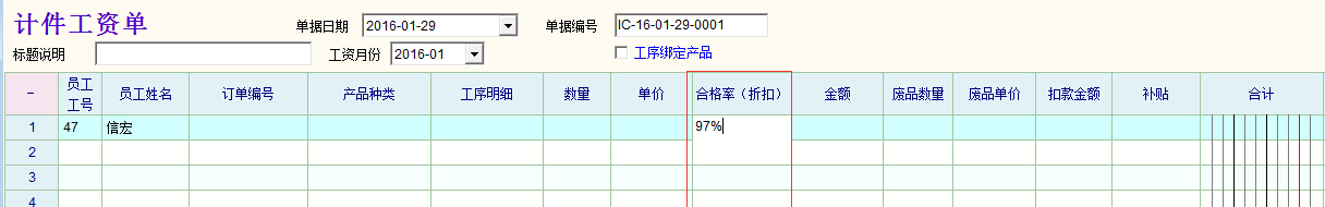 建议在计件工资单中像物资单据一样增加“折扣”(合格率)列。我们的计件工资计算,许多时候只跟加工产品的合格率挂勾而不直接计算最终的废品数量。我们在计件加工过程中,抽检产品的合格率,计件工资简单的以“产品数量*合格率”计算。没有抽检时,就直接以该员工的历史合格率计算。有了折扣(合格率)一项,就可以很方便的满足这个要求。