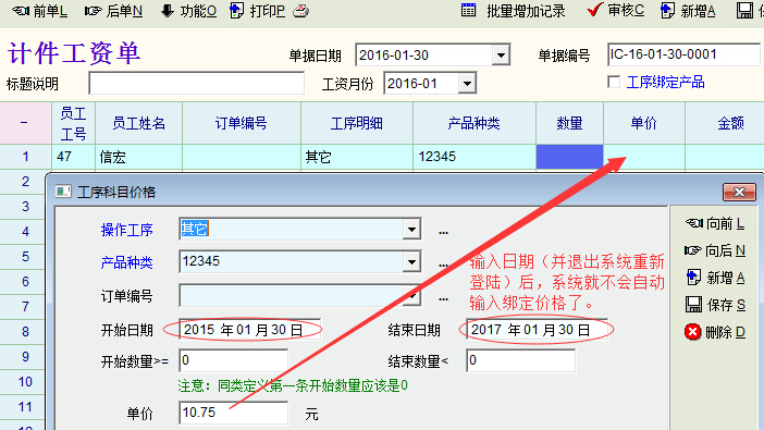 再经过测试,发现只要工序科目价格定义时添加了开始日期与结束日期后,退出系统,再次登陆后,系统就不会自动输入绑定单价了。