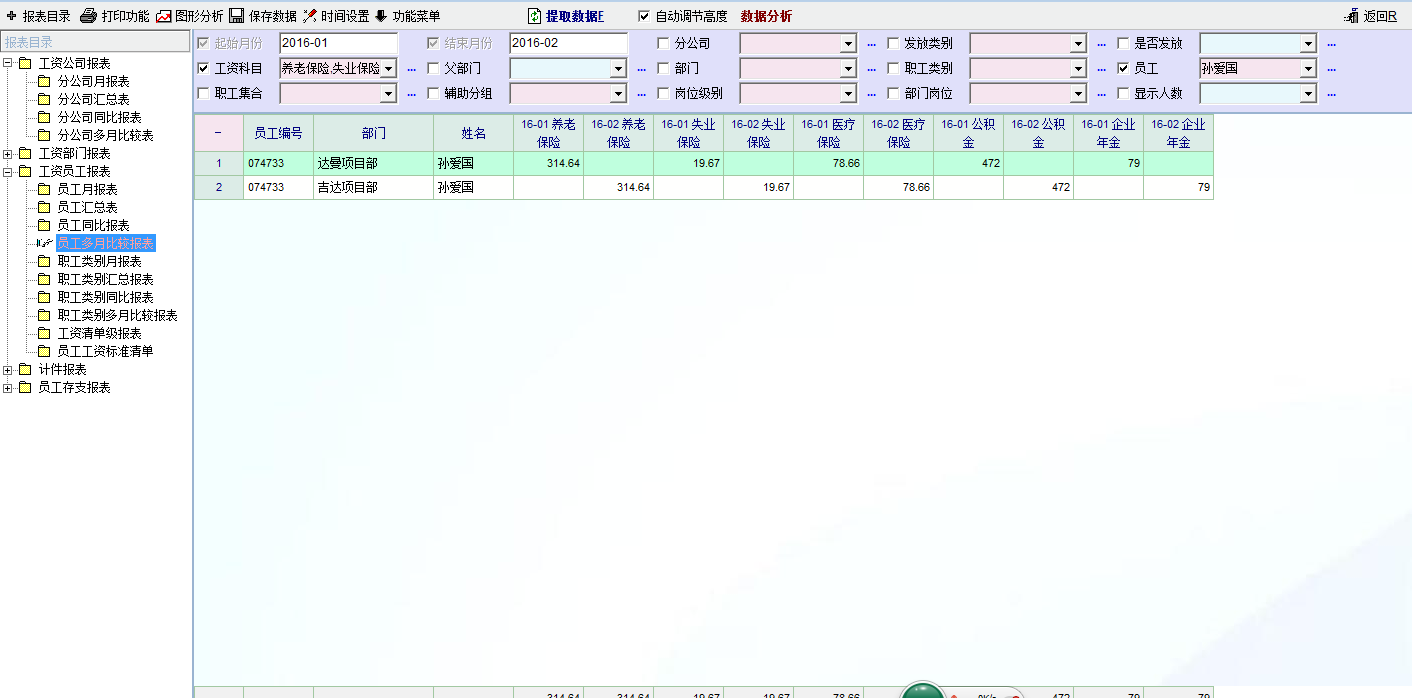 我在每月的工资表中扣除员工的三险二金,想在工资统计报表中查询某个人1年来哪几个月扣缴了,哪几个月没有扣缴。这个员工由于部门调动,统计出来的数据没有按员工号统计,是按部门分开的,所以一个人的扣缴情况统计到了2个人。看能否改进一下,统计数据按员工号来进行汇总,以便一目了然地看到员工每月的扣缴情况。(请看附图)