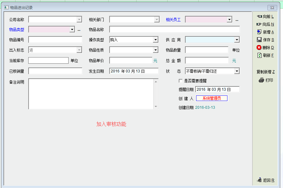 »办公管理模块下的物品进出管理加入审核功能