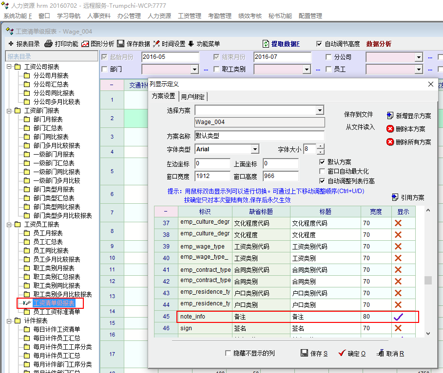 客户端登录工资报表,选择工资清单级报表,进行显示定制,把备注字段显示出来。 浏览器里自动就会有。