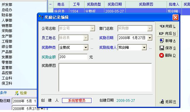 请教一个问题:人力资源软件的“奖励记录”上怎么进行登记(还没有使用过)啊?人员名字与所属部门总是无法找到,批准人也无法找到。比如:我找人力资源部,出现的却是后勤部!这是怎么回事呢?