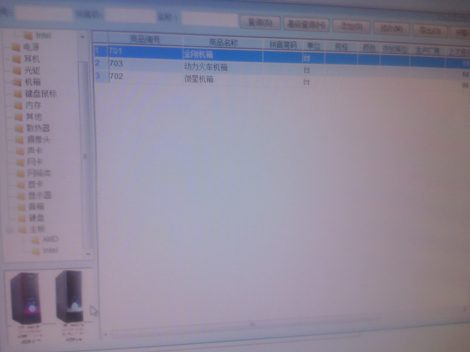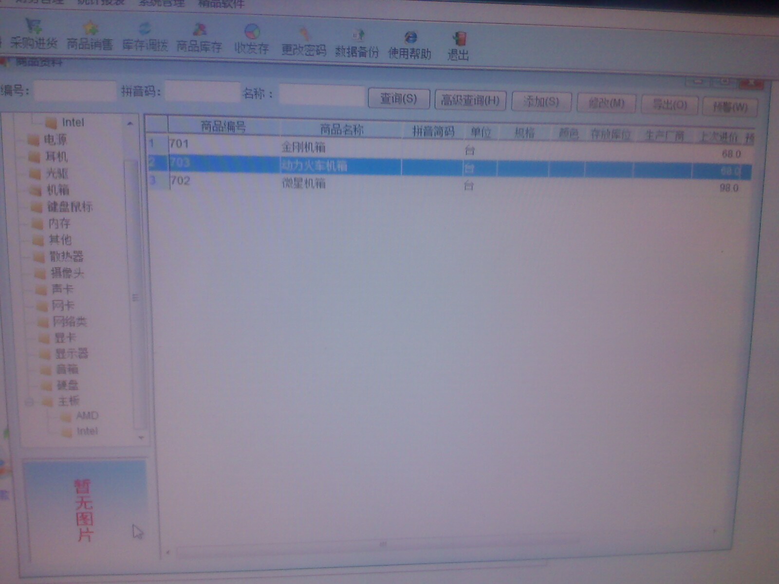 建议添加图片显示功能,既然产品资料里面支持有物品图片,那么应该在库存、采购,及销售各单据选择商品时体现出来(缩略图),双击时操作系统中的图片查看软件能打开图片,这样更为直观。建议添加在选择商品窗口的右下角,那的空位比较大一些