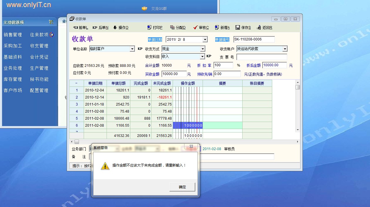 现在使用的版本是20101101,此后只要升级到更新的版本只要使用收款单经常出现"操作金额不应大于未完成金额,请重新输入"的系统警示且单据无法正确保存(连按几次后可保存但单据金额不会有任何变动),请问如解决?