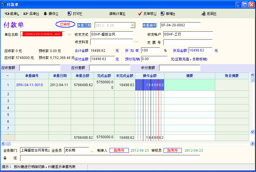 6.这是最最最需要的功能,就是在收款和付款的时候,可以直接看到各差额,如图 |