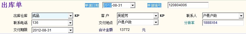 我做了出库单,单据表头有"交付地点"、"联系人","联系电话"、还有"分辨率"项。