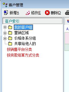 建议在老师客户索引中增加与营销区域、价格体系同级的客户分组。在系统中,新增加客户分组只能在我的客户分组、营销区域、价格体系下面增加,但我的客户分组创创建后必须通过共享给其他操作员进行共享,否则其他操作员没法看到,而营销区域、价格体系则没法按不同的分类标准进行分类,失去灵活性。