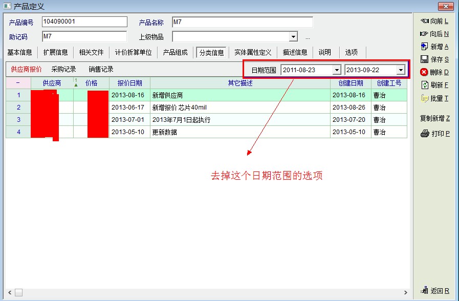 现在的版本中,产品资料的分类信息中的供应商报价,默认是按一个月以内的日期显示,如果报价是一个月以前的,先要设置时间,再切换到其它选项卡,再切换回来才显示报价记录。建议做如下改进。