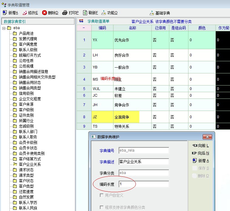 很多的数据字典编码长度只有一位,而进行数据编码定义或是修改的时刻系统又没有限制、提示导致有时候系统操作出现错误,请老师增加数据字典编码位数。