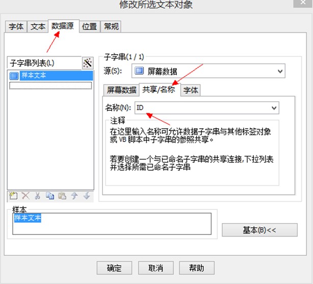 2、  在要变动的参数标签(如上图的样本文本和条码)右键,属性,设好共享名称(程序里默认用id和code)