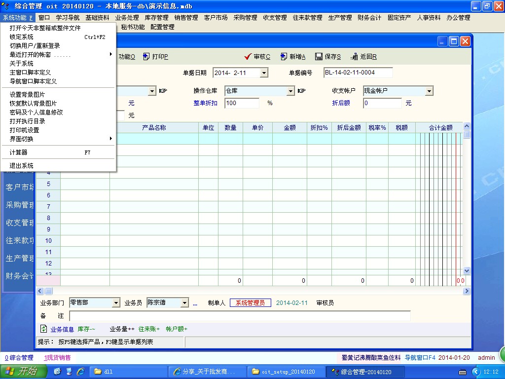 回awfixtdm 1,这个脚本的目的是对于散货在装车备货之时就另外包装好,在包装上直接写上这些散货的客户名称。当送货员送货之时直接送到客户手中,这样可以避免临时装货加快送货员的工作量以及在车内翻箱倒柜最后把车内弄得杂乱--单独的散货可以放在车内固定位置;这在推广新品之时尤其有用--快销品的新品推广常常是量少点多的试销售,客户常常不要整箱而只要一箱中的部分作为尝试。 2,弹窗确实有鸡肋之嫌,这个可以按照各人要求去除,无非就在相应代码之前加上“//”注释完事,如果将来用得着就把“//”去除即可,如果永远不用直接删除; 3,作为备注打印在送货单据上亦不可取。因为有些货品是不允许退换货,而在正常情况下是允许退换货的,这些不允许退换货的产品必须在单据中体现,如果用脚本写下了声明不允许退换货之时,单据的备注信息不可能再写入其他的信息了。这个我有试过。 int cell_change() { { if(res_cat_id==xxxxxx)//xxxxxx指产品目录,如果是指定的某个产品就把"res_cat_id"改成 "res_name==xx产品"或者“res_id==xx产品的编码”就行. note_info='不退货不换货'; }; return 1; } 4,我在脚本之中也写入到了以日期为文件名的文本文件之中,这个文件是每天或者有开单的日期作为文件名的文本文件;当然,增加业务员或送货员再加上开单日期作为文件名就更加合理了。并且我后来还写了一个脚本,在主菜单中直接打开这个文件,避免了对于电脑不熟悉的开单人员去翻文件夹的麻烦。 int 分割线(); { string drawline,addline,today; today=get_cur_date(); drawline='------------------------'; addline='echo '+ drawline+' >> "'+get_home_path()+'\散货记录情况\'+today+'.txt"';//写入到指定目录的文件中 system(addline); return 1; }; int func_before_save() { 分割线(); 分割线();//我是执行两次,就是划出两条分割线,这样两个单据之间就更加清楚 return 1; }; 这个脚本说明:如果想要划几条分割线,就执行几次“分割线()”这个自定义函数。并且放在“int func_before_save()”这里,就是每个有散货的单据得以区分,这个函数是在保存前就执行“分割线()”这个自定义函数。如果想放在其他如审核,打印等等都行,但不建议放在“int cell_change()”之中,不然每修改一行都会触发,也就是都会划线,做不到区分不同单据的目的。; 以下的脚本是在主菜单添加打开这个以开单日期的项目,在系统功能--主窗口脚本定义: int main() { string today,res; today=get_cur_date(); res=get_home_path()+'\散货记录情况\'+today+'.txt' menu_add_file('N_Top_System',0,'item_run_today_csp','打开今天非整箱或整件文件',res); return 1; } 其实这个脚本是为我自己以及我一个朋友写的(我们都是做调味品批发的,只是在不同的省)。不要把那些个体老板们都想得是电脑高手,他们短期雇佣的人也不会是只开单据的人,他们能够把软件已有的功能用清楚都非常不错了--包括我自己也还没有用清楚这个软件。 |