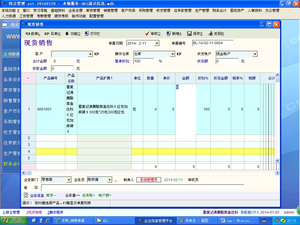 5,当你修改了单据中的数量"而鼠标光标离开这个列之时,在“产品扩展1”(假定没有改名)下就自动的会将你在产品定义好的名称,规格和型号填入该列之中