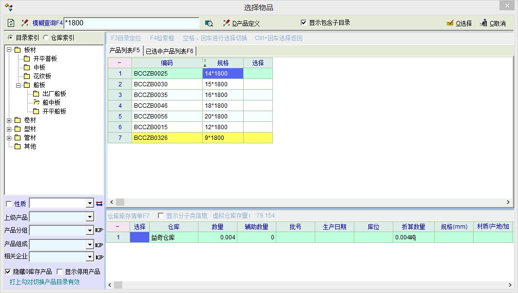 2、而在开单时选择-相同目录相同规格-时只有7个产品有库存状况(包括正负库存),请看开单时先择产品图