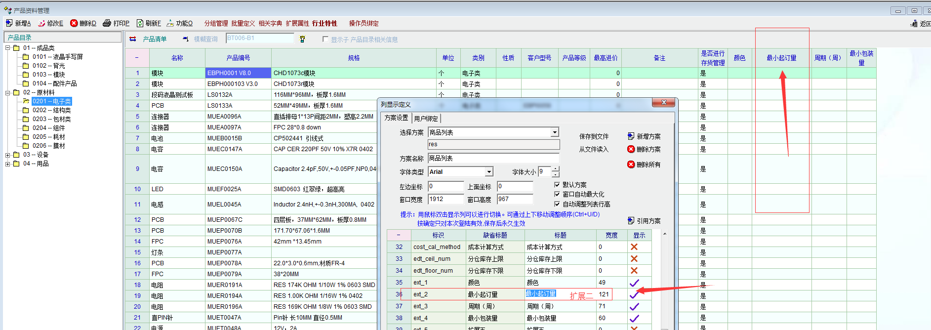 目前我们把产品资料里面的扩展二改为了最小起订量,但是这个目前只能做参考查询使用,不知如何操作可以系统调用?