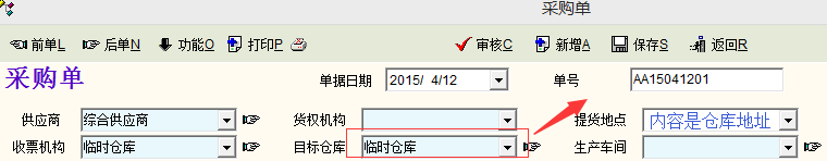 这个仓库的地址能不能,提取出来到,采购单的提货地点。 |