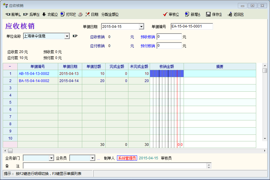 你看你第一张图片  应收 20 应付10 可以冲抵,两行各写10就行了 。你显示定制把类型显示出来看的更明白。