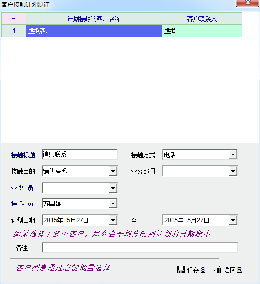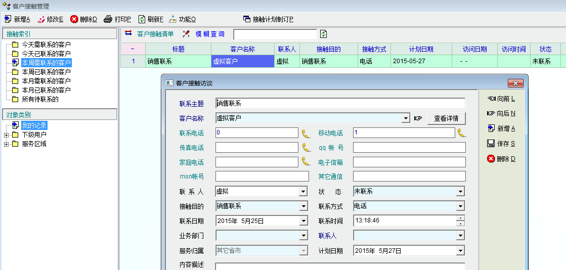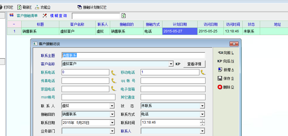 当点击打开计划的接触计划后,输入接触主题,点击保存(联系状态仍保持未联系),发现系统自动生成了一个接触记录,默认时间为当前时间
