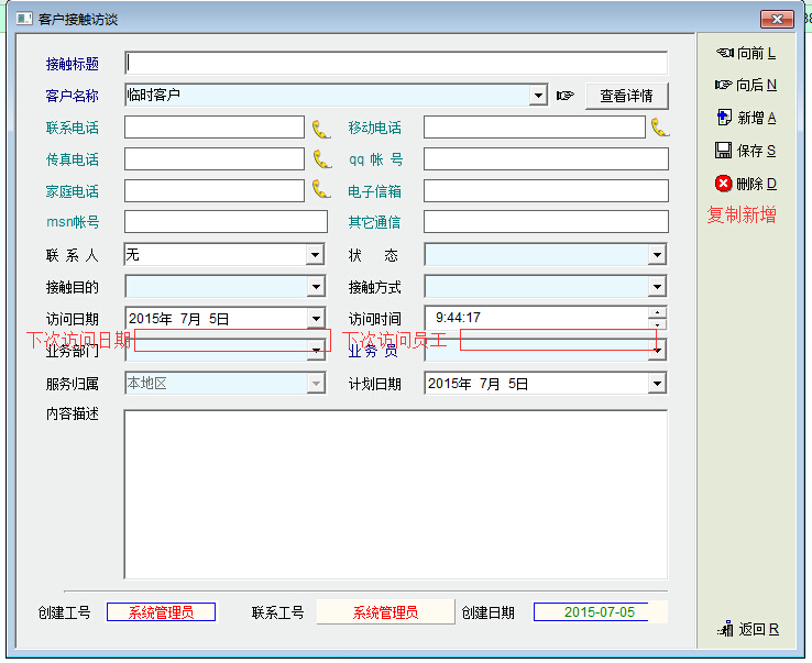 如图,客户联系一般都是一个持续进行的长期行为,这次联系结束了,但事情可能还没有完全结束,需要再次跟进,这时就需要快速确定下次联系客户的时间或计划,希望在客户接触访谈中可以增加“下次访问日期”,快速制订下次的联系计划、提醒。最好同时增加一个指定下次次联系员工(下次访问员工)的输入框,同时默认下次访问员工为本次联系的员工。
