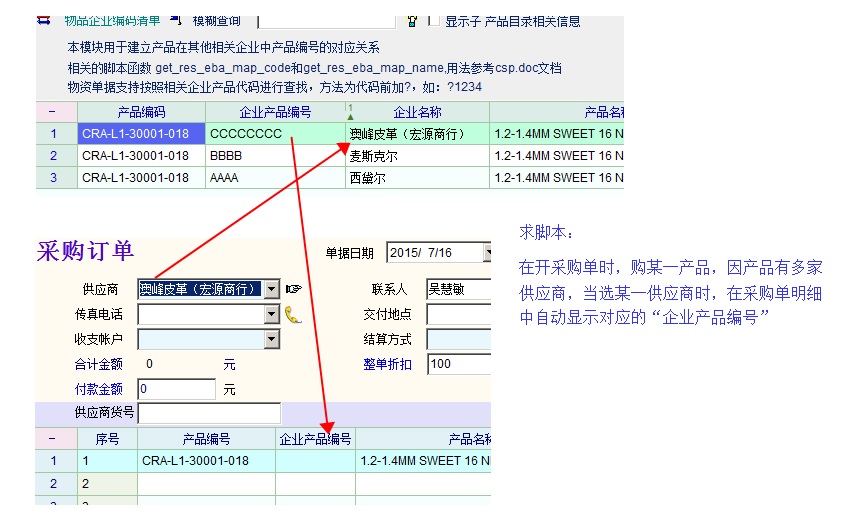 在开采购单时,购某一产品,因产品有多家供应商,当选某一供应商时,在采购单明细中自动显示对应的“企业产品编号”,请老师提示,指引,或直接给脚本