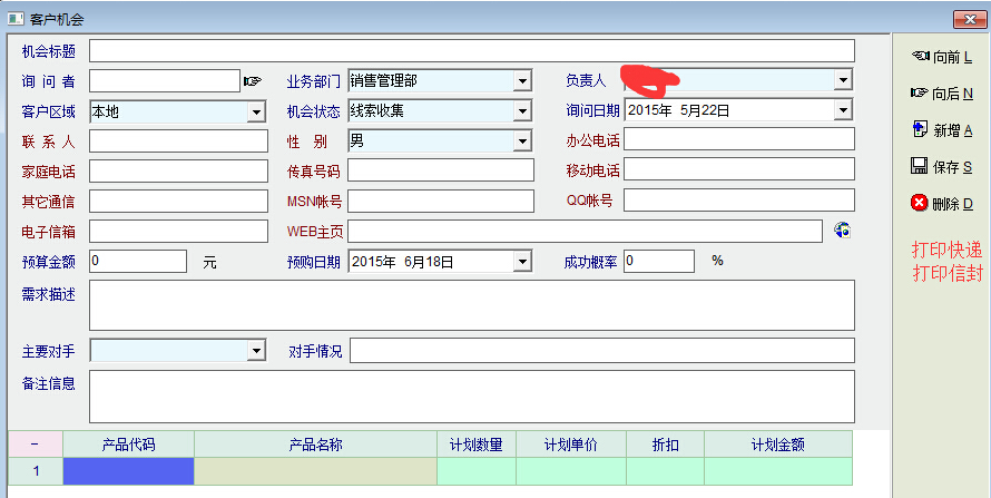 7、在客户机会中,没有可以快速查看客户的详细资料的方法(如果客户是已经建档的老客户的话),如果查看当前老客户的详细资料,必须切换到导航界面,打开客户管理,再选择当前客户后才能查看相关详情,太复杂,效率也太低。建议添加快速查看老客户详细资料的快捷方法(右下角快速打开)或快捷键。