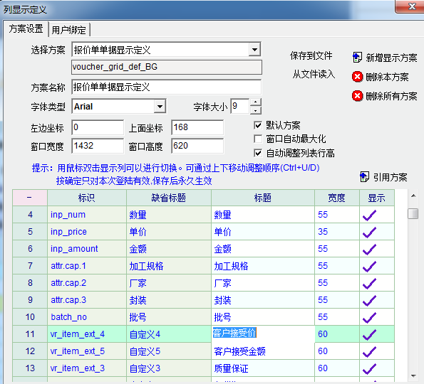 6、在明细内容中像物资单据一样添加一些可以自定义的扩展列,还有备注列,行业属性扩展列等,并且添加列内容显示定制功能。这样,在许多情况下,客户机会可以取代系统中的报价单,不但顺畅了流程,提高了效率,也可以充分发挥客户机会的提醒功能,非常高效、方便的对销售机会进行跟踪、管理。