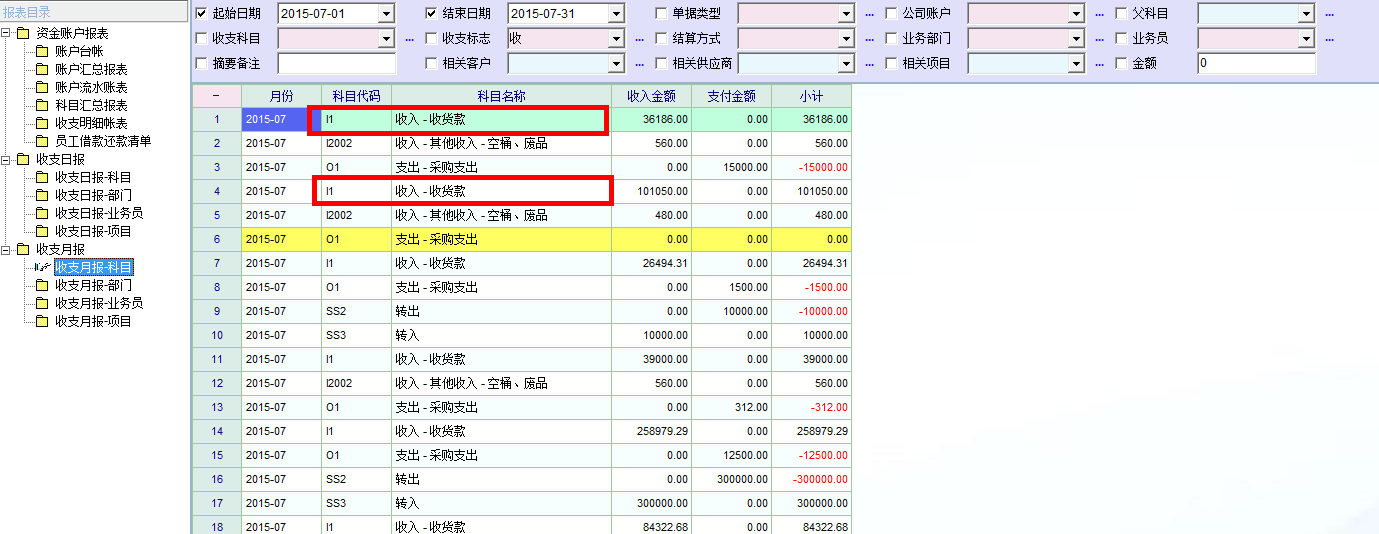 收支月报的数据应该是所选月份的各科目(部门、项目)的汇总合计数,根据现在报表所显示的数据来看(见下图),既不是按天汇总,也没有按月汇总,应该是算法中的条件设置有误,导致统计的数据混乱