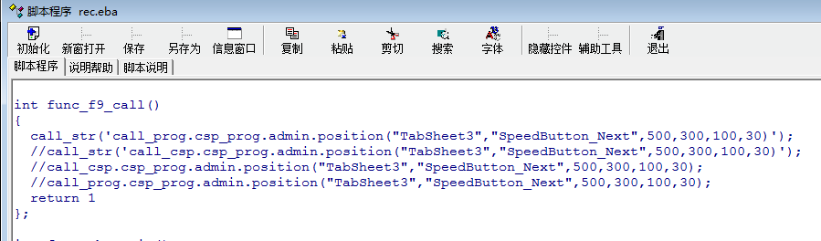 如何从A脚本中调用B脚本中的自定义函数?比如,在csp_prog_admin中自定义函数如下 int position(string 上级控件名,string 控件名,int x,int y,int w,int h) { gui_set_parent(控件名,上级控件名); gui_set_x(控件名,x); gui_set_y(控件名,y); gui_set_w(控件名,w); gui_set_h(控件名,h); msg("测试"); return 1; }; int test() { return 1; }; int main() { msg('hello,world'); return 1; }; 然后想在客户管理脚本rec.eba窗口中引用position函数,在rec.eba脚本中写入如下语句 int func_f9_call() { call_str('call_prog.csp_prog.admin.position("TabSheet3","SpeedButton_Next",500,300,100,30)'); return 1 }; 引用position函数,但结果并不正确。 也测试过以下几种写法 call_str('call_csp.csp_prog.admin.position("TabSheet3","SpeedButton_Next",500,300,100,30)'); call_csp.csp_prog.admin.position("TabSheet3","SpeedButton_Next",500,300,100,30); call_prog.csp_prog.admin.position("TabSheet3","SpeedButton_Next",500,300,100,30); 但结果都不正确。 请教老师,正确的方法应该是什么呢? |