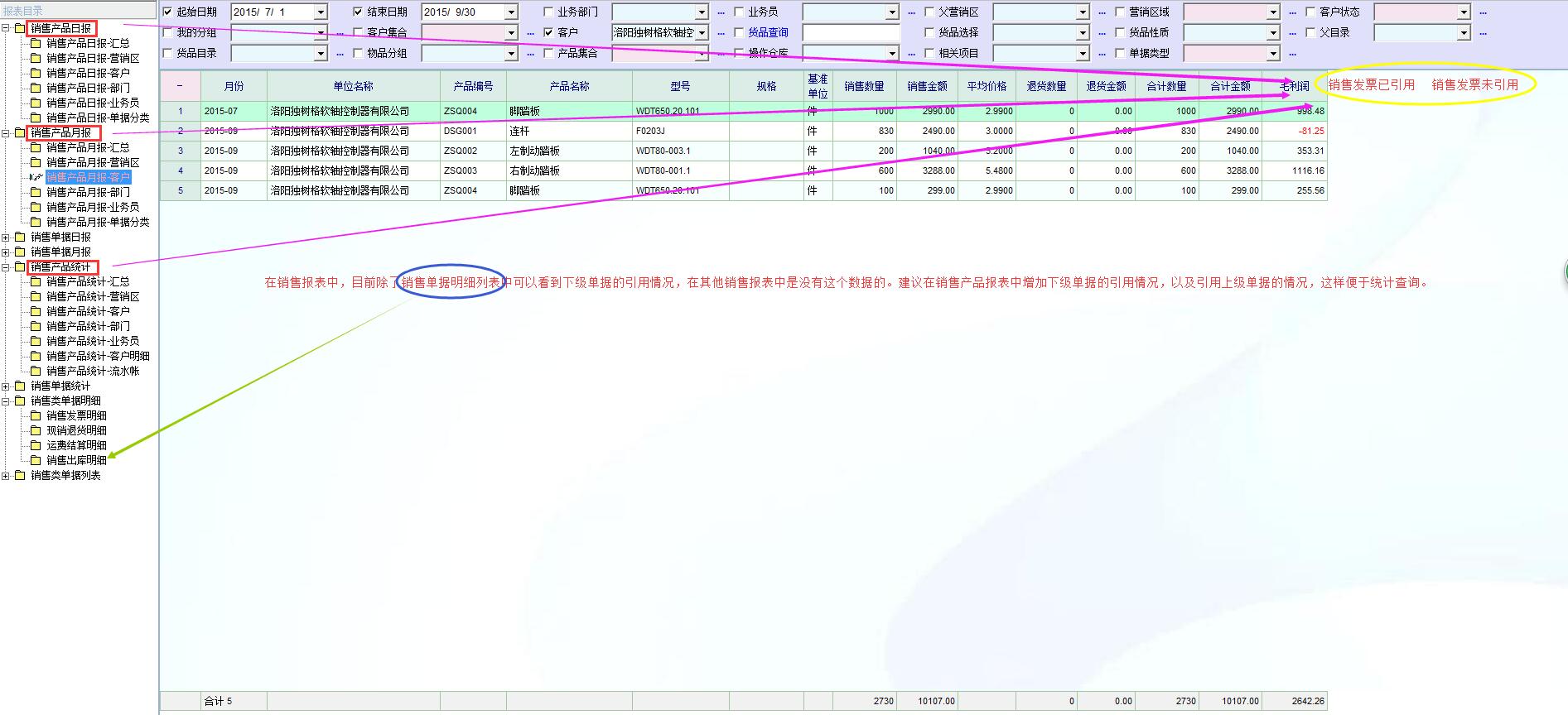 目前系统只有在销售(采购)报表的单据明细报表中可以显示下级单据的引用情况和引用上级单据的数据,在其他销售(采购)报表中没有这些数据,这样对统计和查询来说非常不便。举个例子,我单位“销售出库”的下级单据是“销售发票”,主要是为了记录哪些销售单已经开过发票,哪些没有。我们与客户之间是以客户返回的收货通知为依据开票的,许多时候都是有时间差的,有时候甚至会晚1-2个月。所以开票时我们经过需要了解之间的销售出库哪些是开了发票,哪些没有,但是在销售报表的统计中,没有这些数据,只是在单据明细中查询,非常不便,目前只好用电子表格平时记录,希望能够在销售(采购)的产品报表中增加这些数据,以便于统计查询。