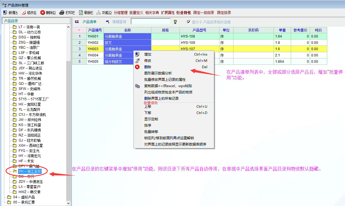 我公司为制造企业,是定单式生产,我公司将同一客户的产品作为独立的产品目录,某些客户由于今后不再有定单,在产品资料里逐一停用非常不便。如果在产品资料管理中增加停用目录功能(目录停用后该目录下的产品自动停用),或者在产品清单中全部或部分选择产品后增加“批量停用”功能,就方便多了,希望能够改进。