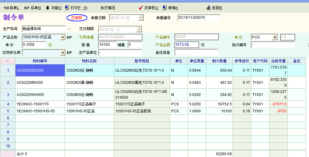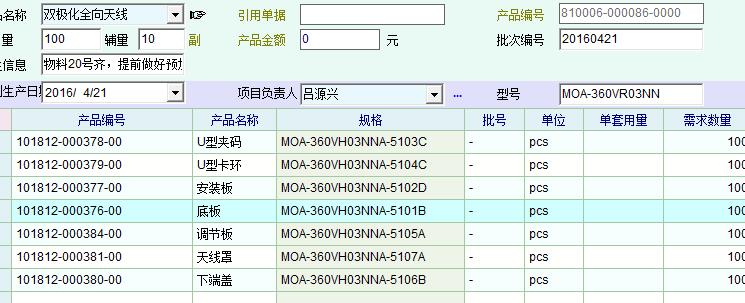 追加生产单(制令单)表格,如此图,就是在领料单中将产品编号(主编号)带入各物料组件下。如单位用量一样。 |
