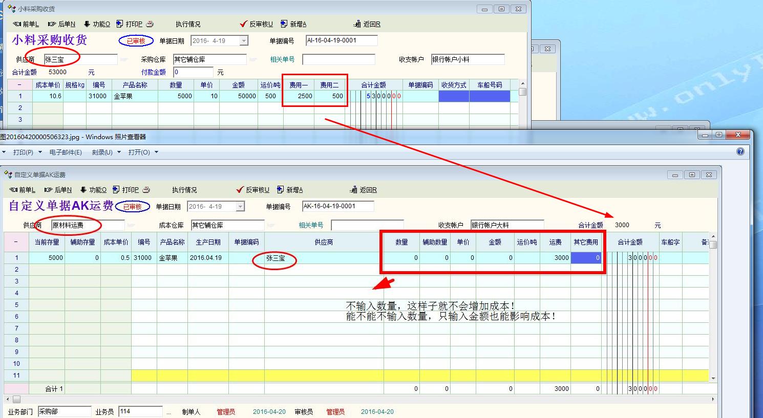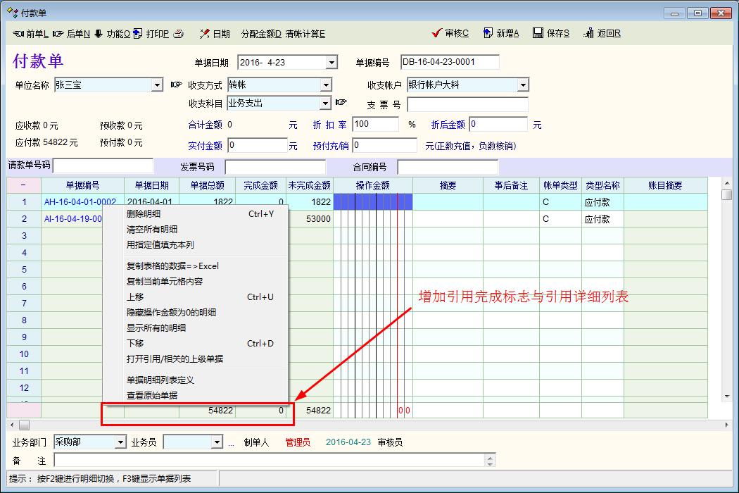 问题一,建议在采购管理与销售管理增加单独录入费用核算! 个人认为: 因为很多时候采购与销售的物流费用是单独支付的,虽然现在有费用一与费用二可以添加,但是在应付核销的时候会把本来属于运费的金额多支付给供应商与客户这是不方便的,虽然应付的时候可以不支付运费部分可是这样会核销不完全! 方法1: 把采购管理与销售管理的金额与费用独立分开。 方法2:在采购与销售时只添加品种的金额不添加数量,OIT是不会自动运算的,如果可以直接增加金额也会运算,也是一种解决方法, 方法3:在核销的时候可以选择性的支付金额与费用一,费用二, 方法4:把采购管理与销售管理的金额与费用一,二独立一些,同时在核销的时候可以选择性的支付金额与费用,这样最完美!!! ------------------------------------------------------ 问题二, 有时候有些小数是扣除的, 付不完全, 能不能在收付款那里增加引用完成标志,就好像单据上下级引用一样,!! --------------------------------------------------------------- 问题三, 在付款单明细下面右键菜单,有个功能项要改动一下,如果 清账核销的时候,只核销部份单据时,点击 隐藏操作金额为0的明细后,再点清账核销,就会把已经隐藏为0的单据也核销在里面.能不能右键菜单增加一项: 删除操作金额为0的明细,这样就核销就不会把已经隐藏的单据连在一起核销!! 问题如下图: |