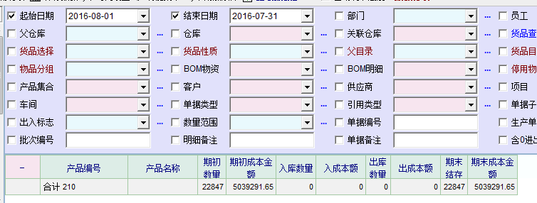 我7月的出入库做完以后,汇总报表中得到7月1日到7月31日  其中7月31日的期末库存余额是5039267.91