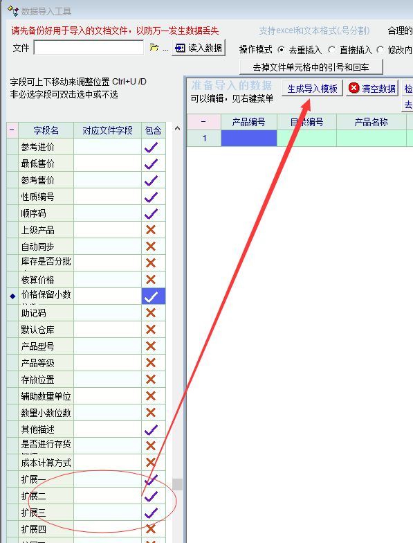 2、关掉程序重新登陆,导入刚才生成的模板,相同的字段没有自动勾选
