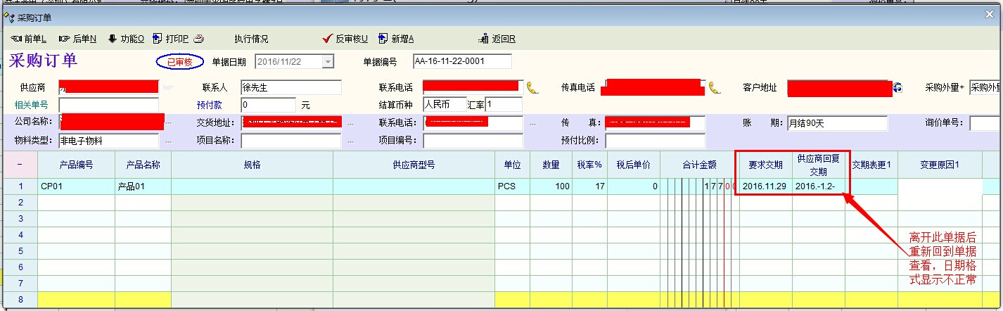 其中有几项明细扩展项是日期内容分别为【供应商回复交期】、【变更交期】,但是实际操作后,日期格式显示不正常。详细如下:
