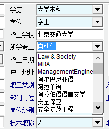 如图,“自动化”专业已经做到“数据字典”里了,并且数据字典有2131条记录,但在员工卡片里,单击下拉框,并没有定位到“自动化”专业(通常下拉框里会显示选定状态的“自动化”)