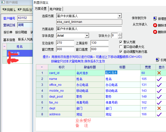 如图,希望能通过直接通过联系人列表就能看到联系人的备注及业余爱好相关资料。请老师添加定制显示联系人名片备注及业余爱好字段。