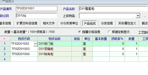 1.在产品组成里定义了下级产品,也录入了下级产品数量,整套由(移门柜+转角柜+顶箱柜),所以只录入下级数量。